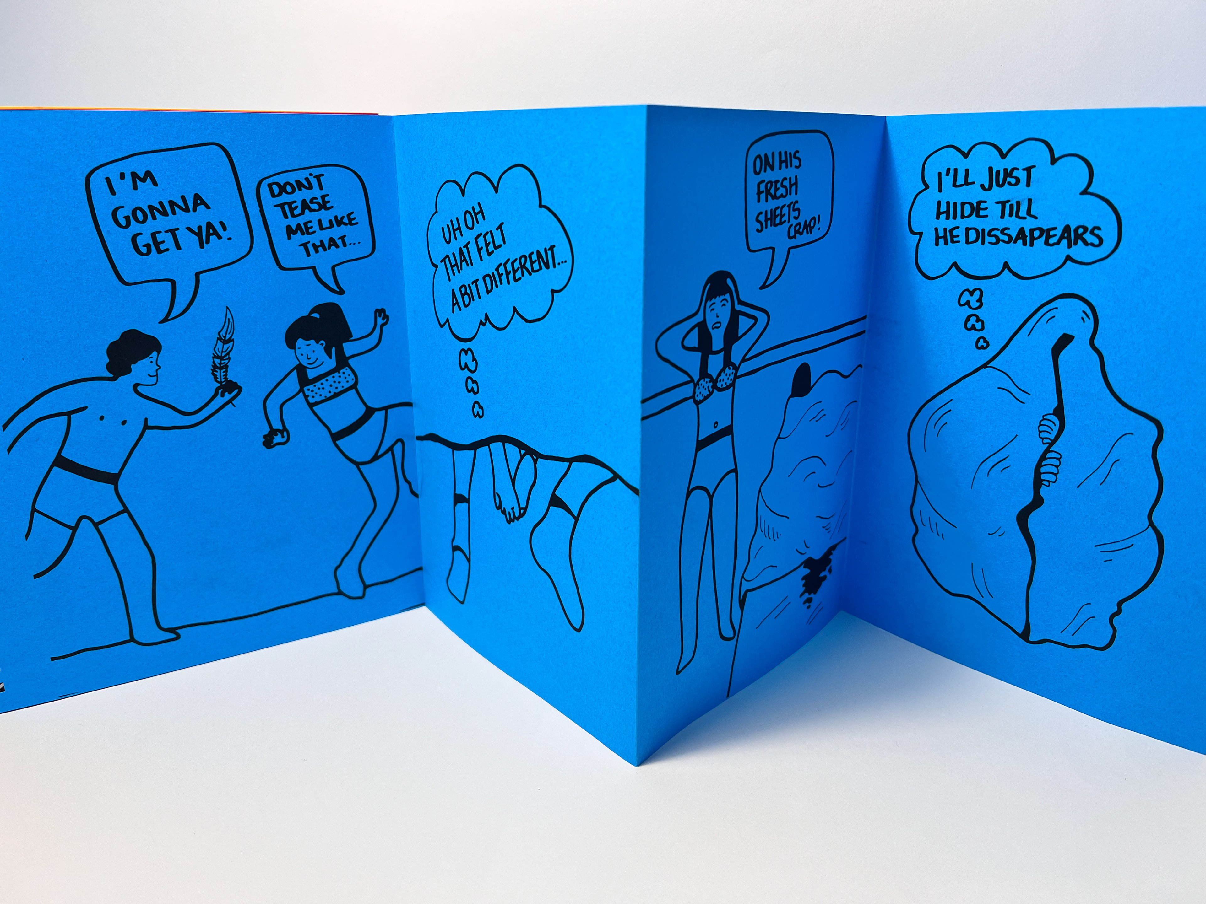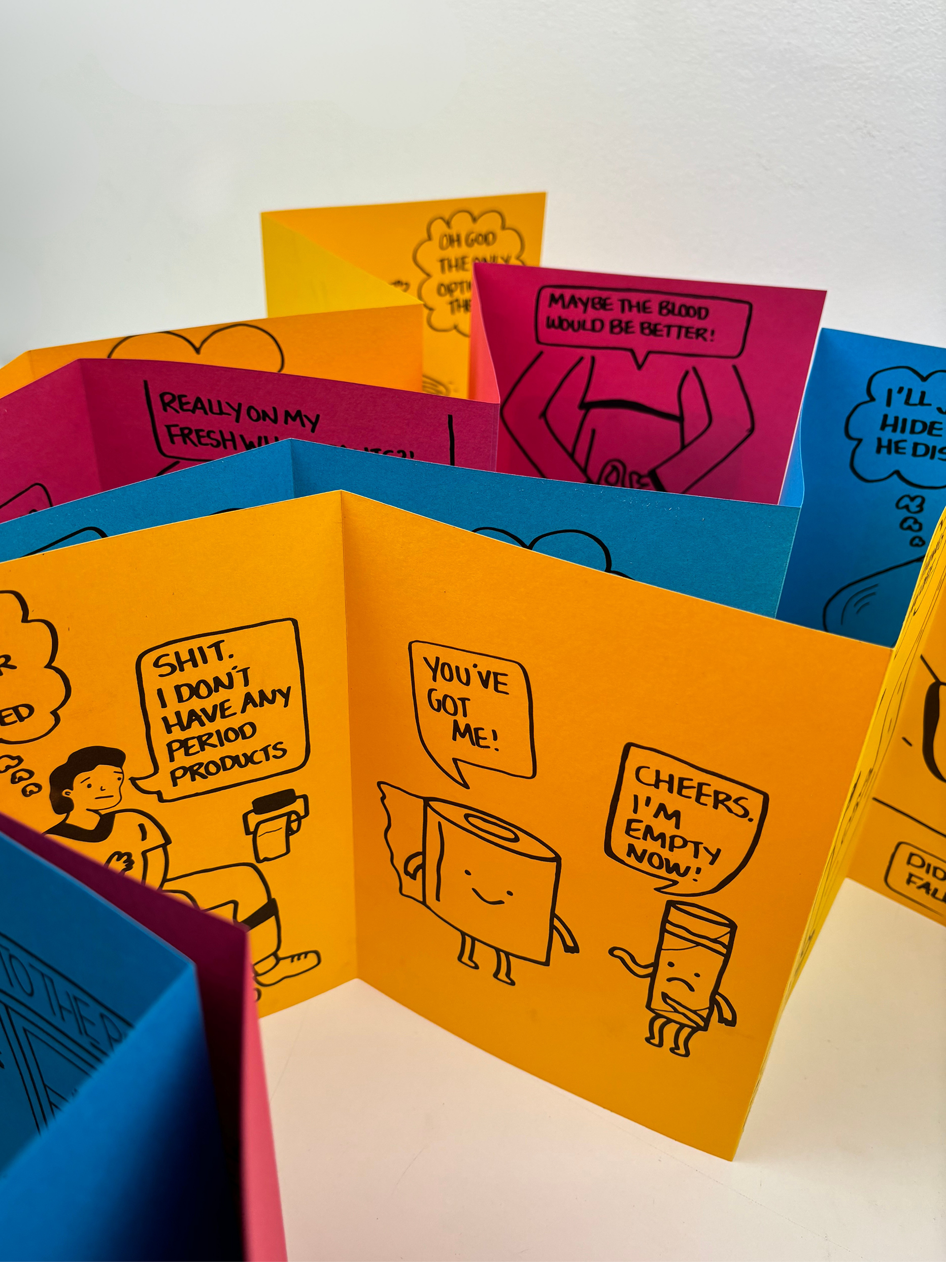 Embarrassing Period Moments is a publication created to challenge the shame and stigma surrounding periods. The project uses humour as a tool to make difficult or awkward experiences relatable and open for discussion. Hand-drawn illustrations and speech bubbles were used to tell short, humorous stories, presented in a concertina-style octopus book format. This playful structure encourages interaction while reinforcing the light-hearted tone. By using humour and informal storytelling, the publication aims to normalise shared experiences and encourage open conversations around menstruation.